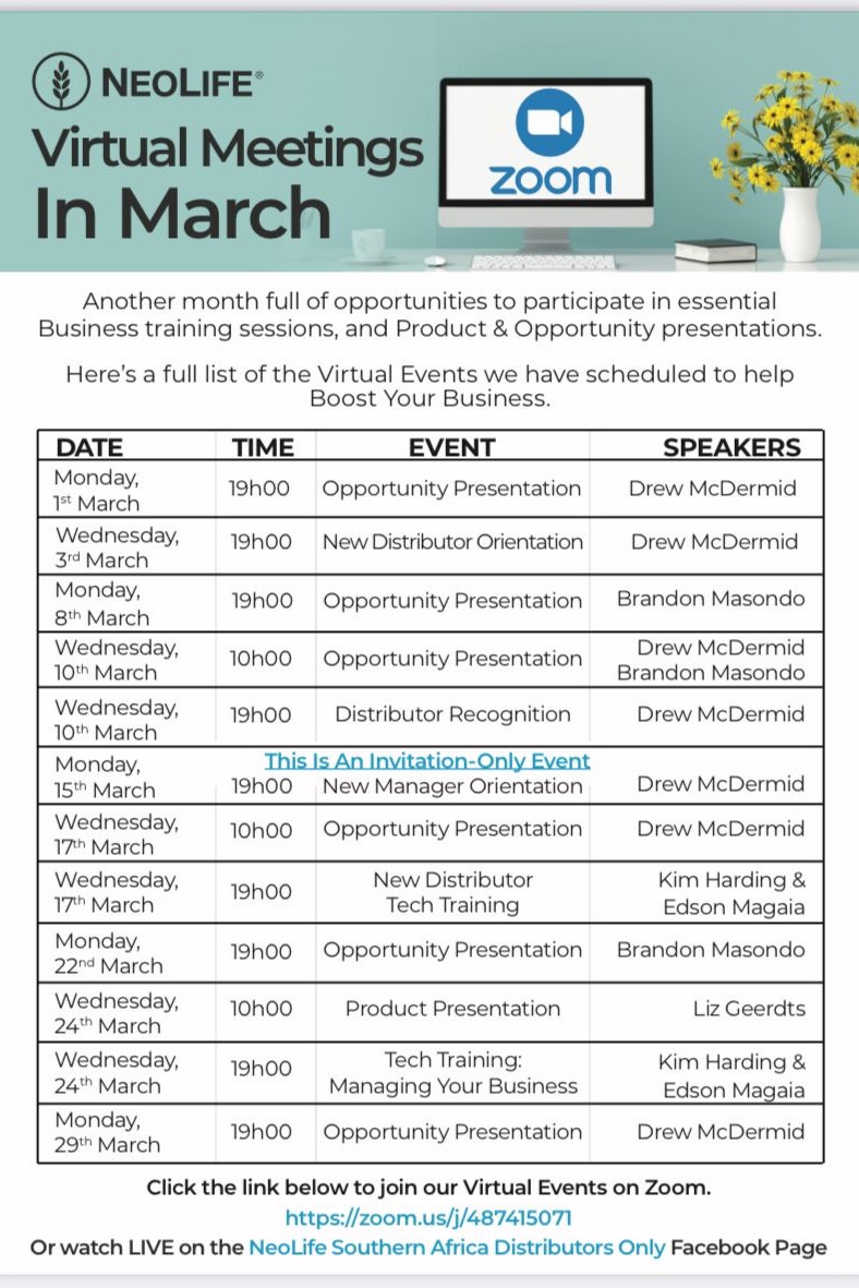 NeoLife offers us free Virtual trainings every month , check out the schedule below for more information.